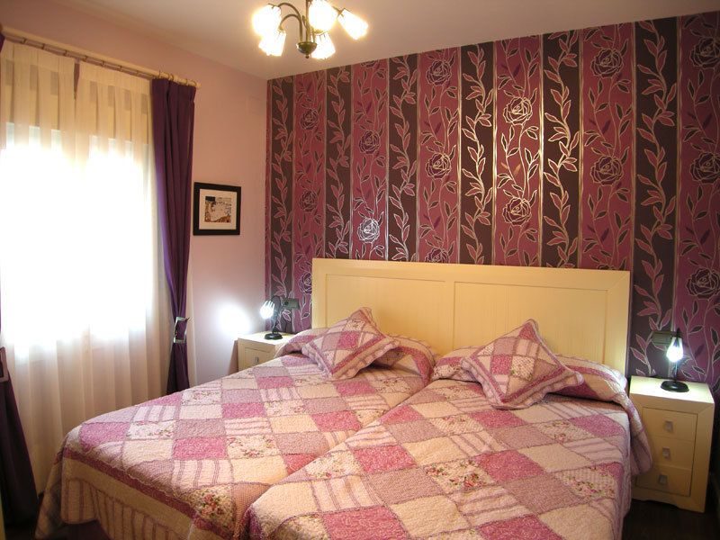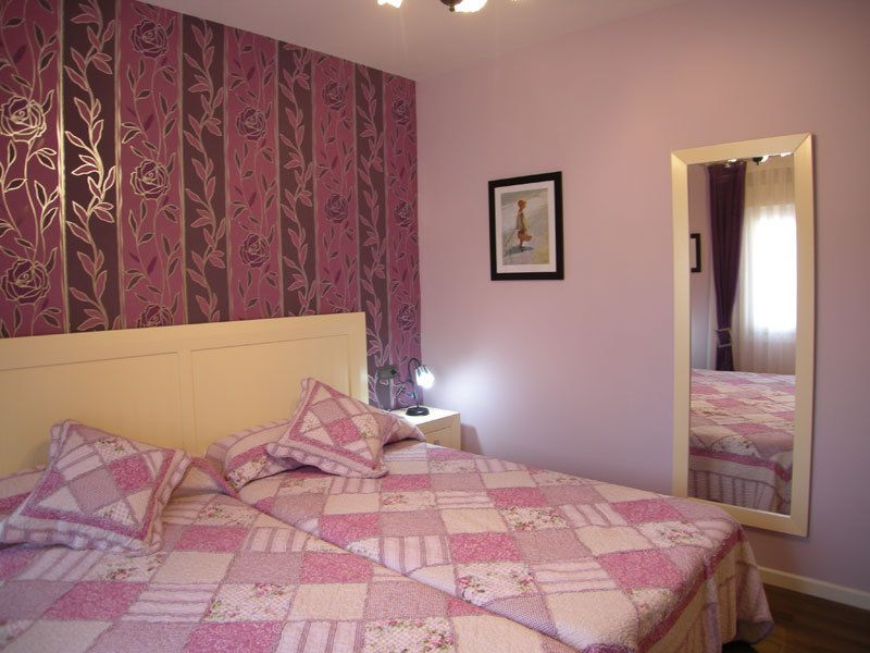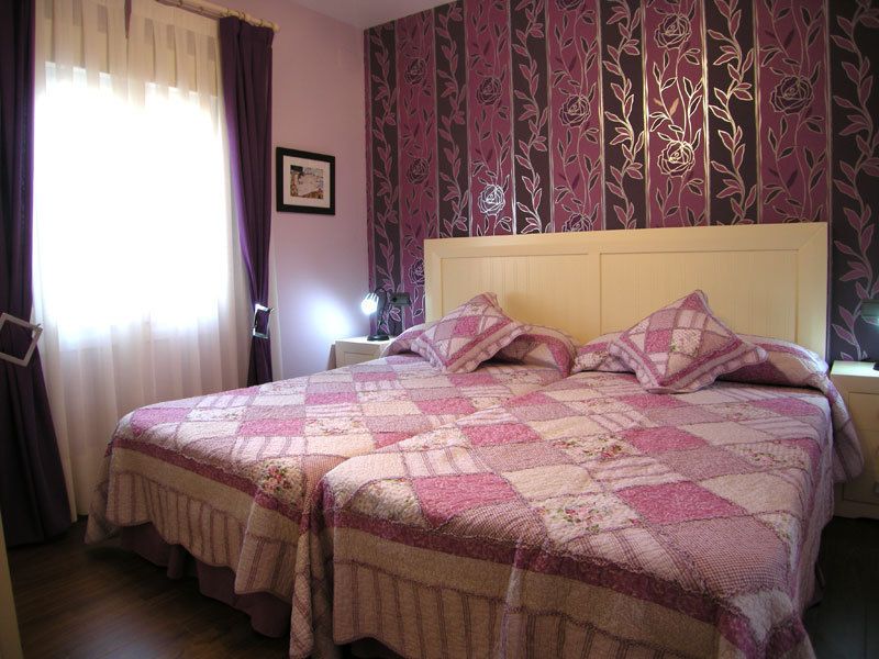 Esta bonita estancia consta de dos camas de 105 cm, que se pueden juntar como si fuera una sola cama. Empapelada en el cabecero un precioso estampado de color malva y pintada en el resto con el mismo color, junto con su mobiliario en blanco roto, hacen de esta estancia un lugar coqueto y agradable donde apetece dormir.